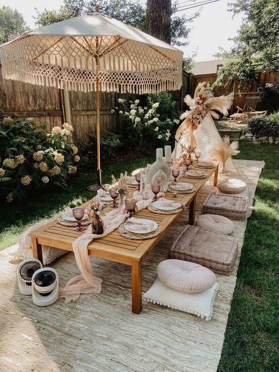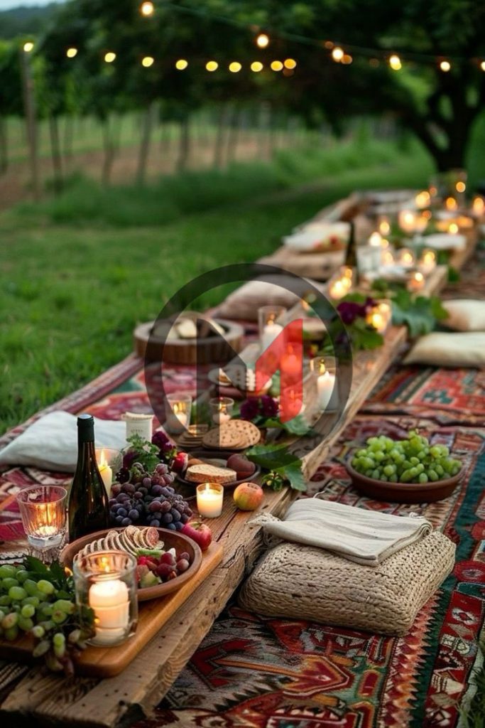Piknik di ruang terbuka dengan tema bohemian adalah pilihan yang santai namun tetap estetik. Anda hanya perlu menyiapkan karpet, bantal warna-warni, dan meja kayu rendah untuk menciptakan suasana yang nyaman.